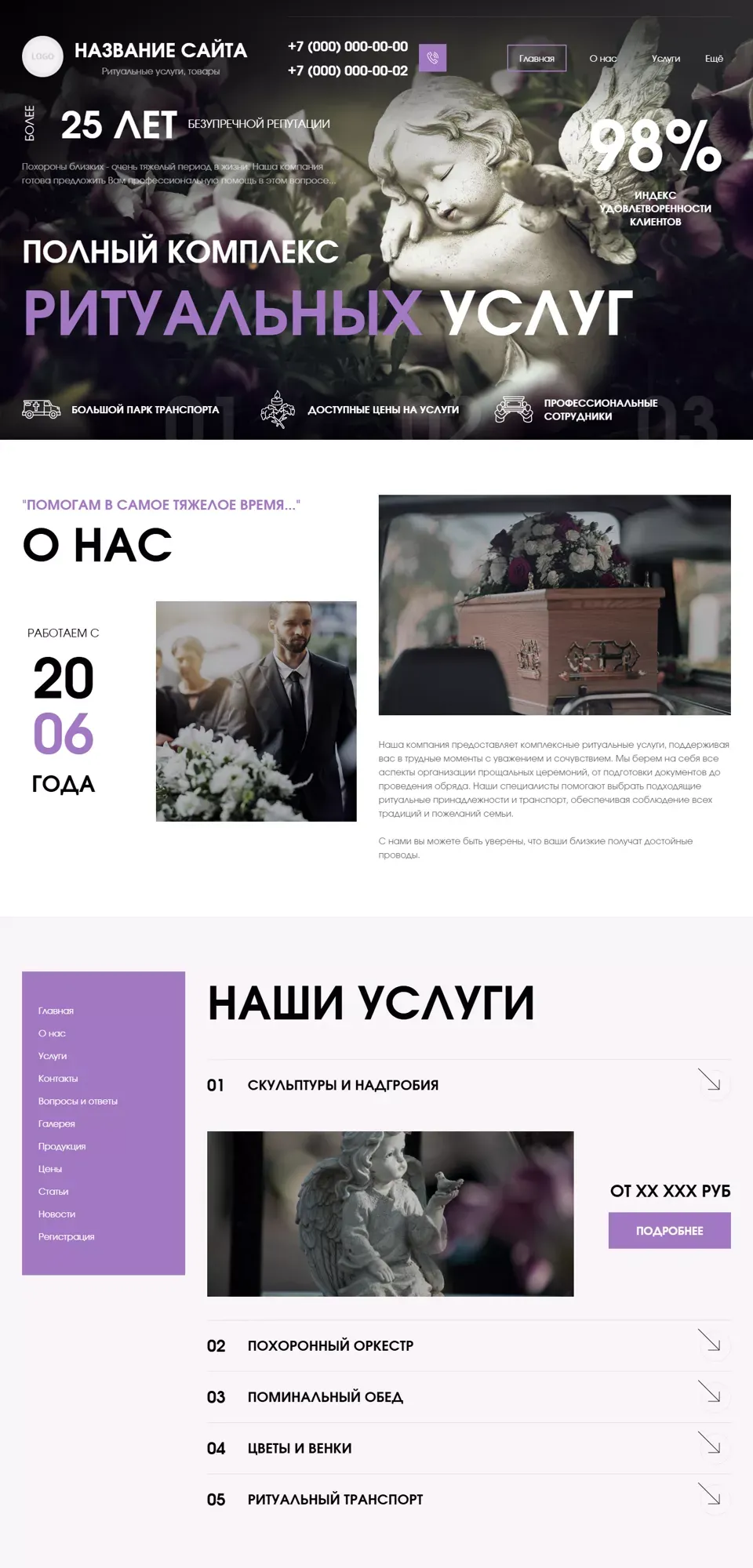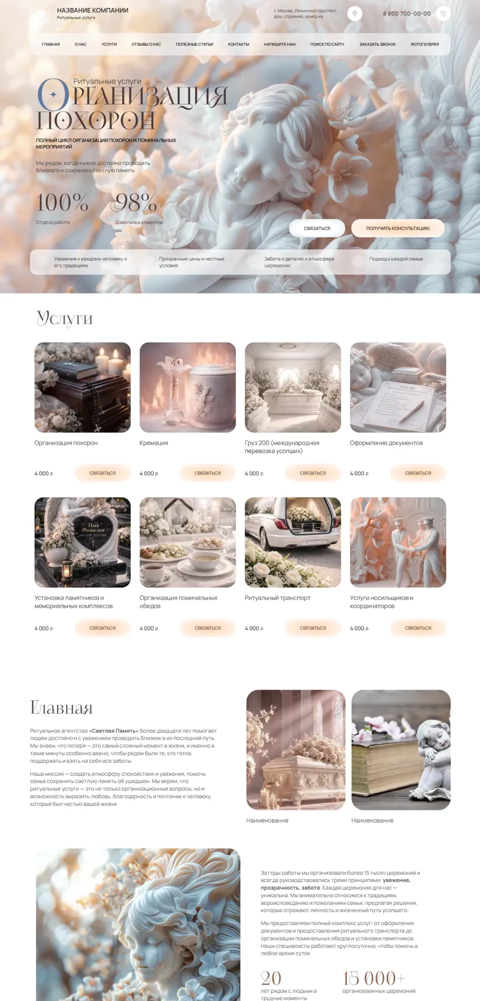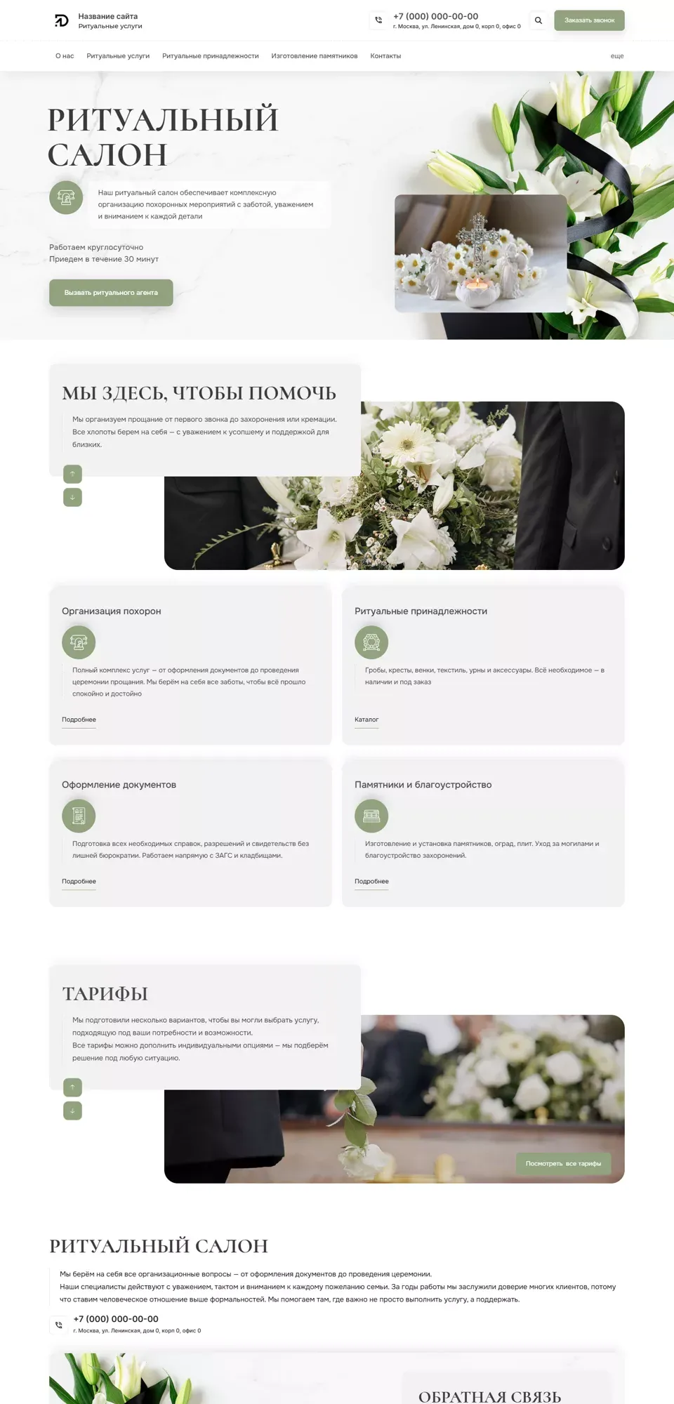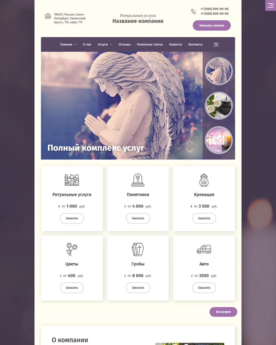 Я создаю сайты с учетом специфики ритуальной сферы: спокойный дизайн, удобная структура, быстрый доступ к услугам, ценам, контактам и форме срочной связи. На сайте можно разместить информацию об организации похорон, перевозке, оформлении документов, подборе ритуальных принадлежностей, поминальных обедах и других услугах.