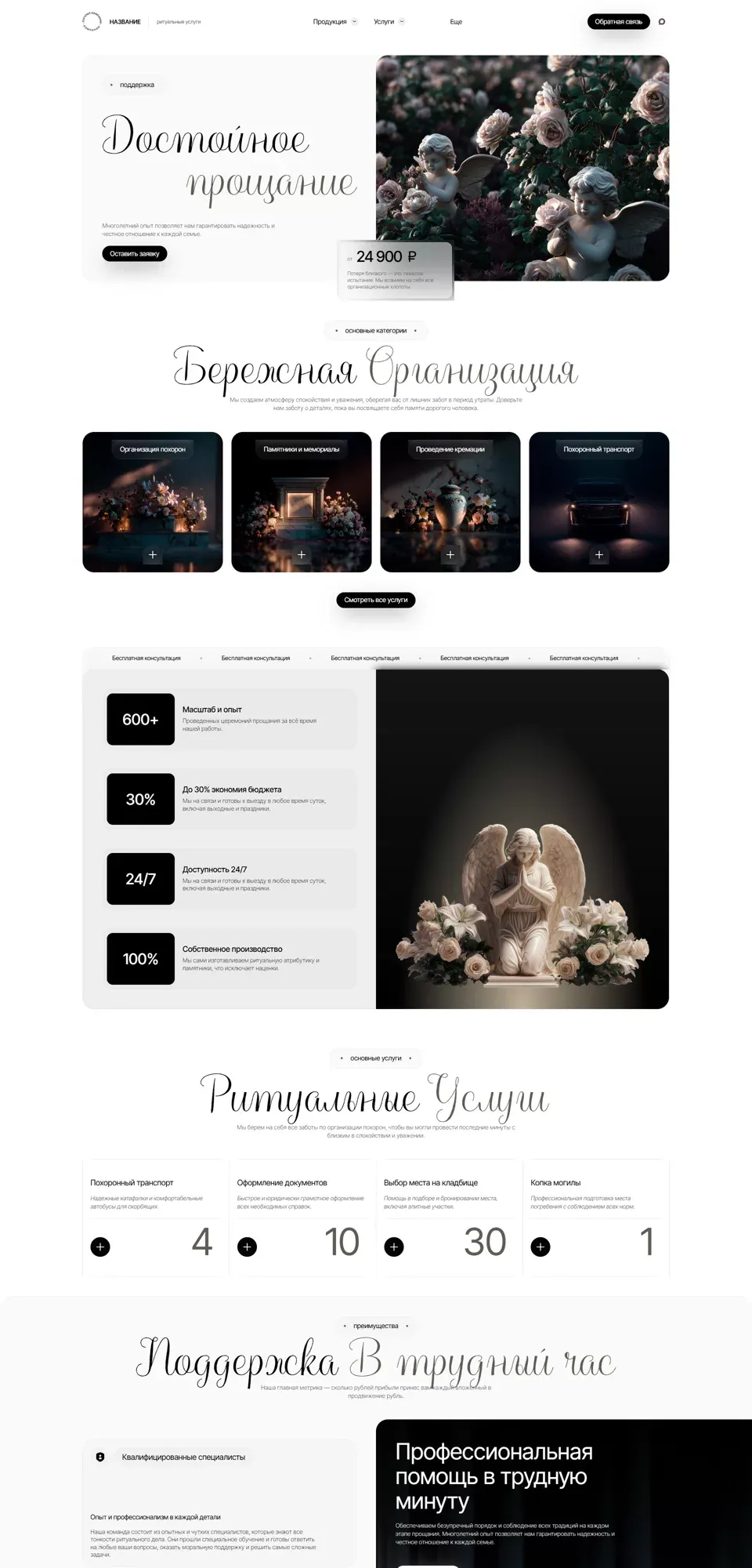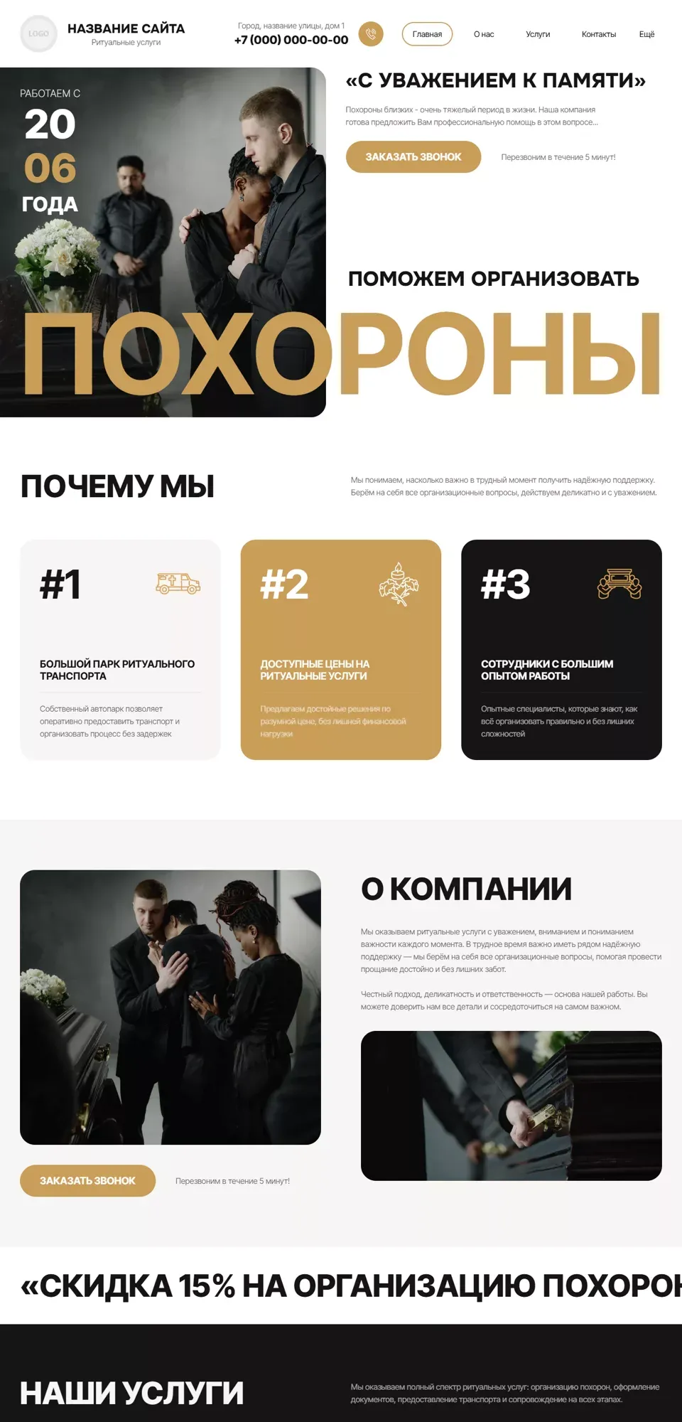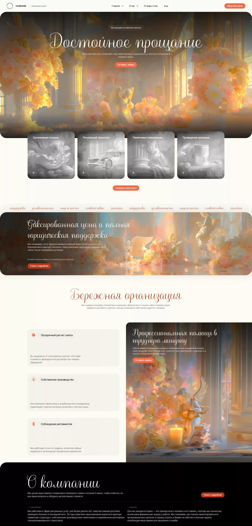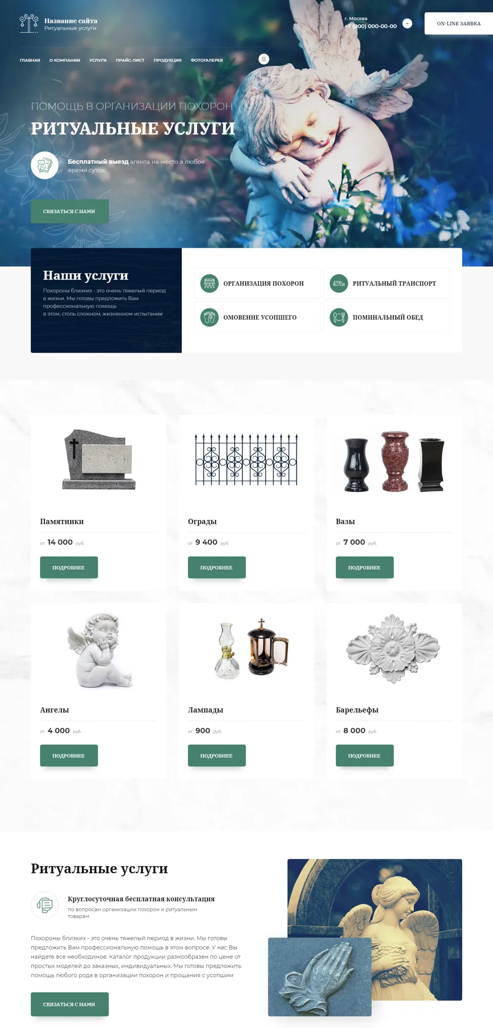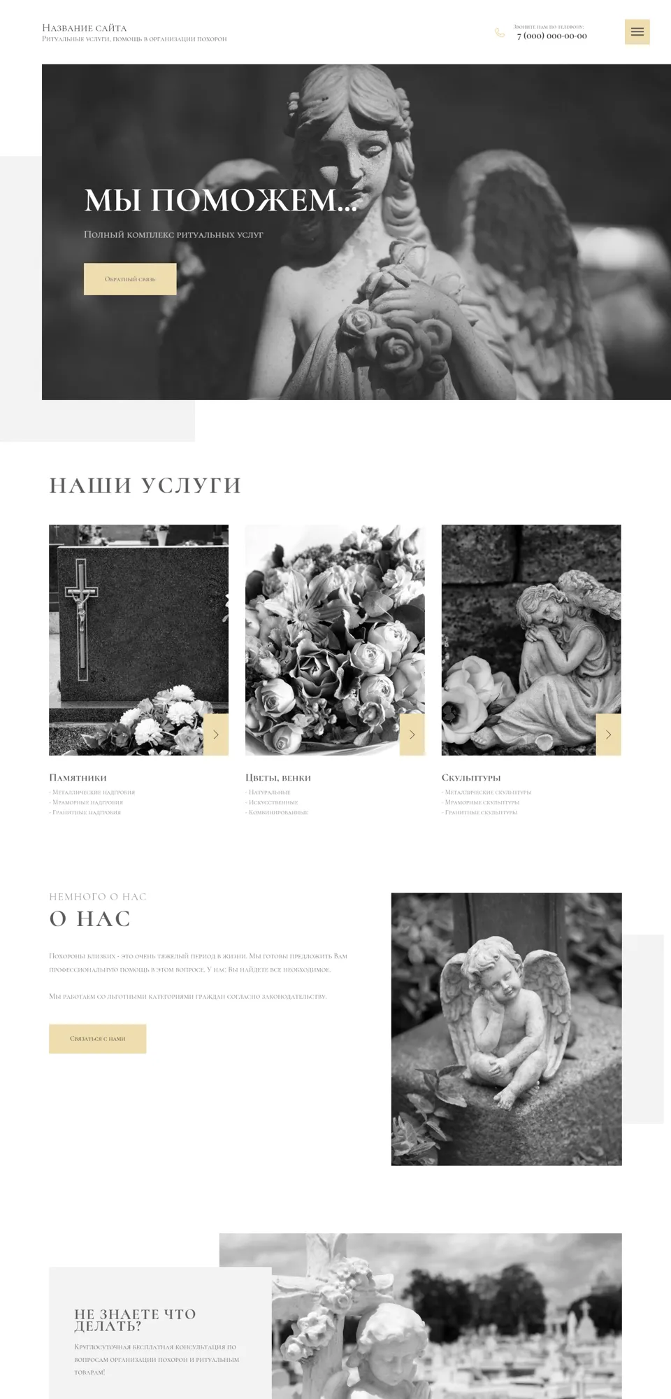 Я создаю сайты с учетом специфики ритуальной сферы: спокойный дизайн, удобная структура, быстрый доступ к услугам, ценам, контактам и форме срочной связи. На сайте можно разместить информацию об организации похорон, перевозке, оформлении документов, подборе ритуальных принадлежностей, поминальных обедах и других услугах.