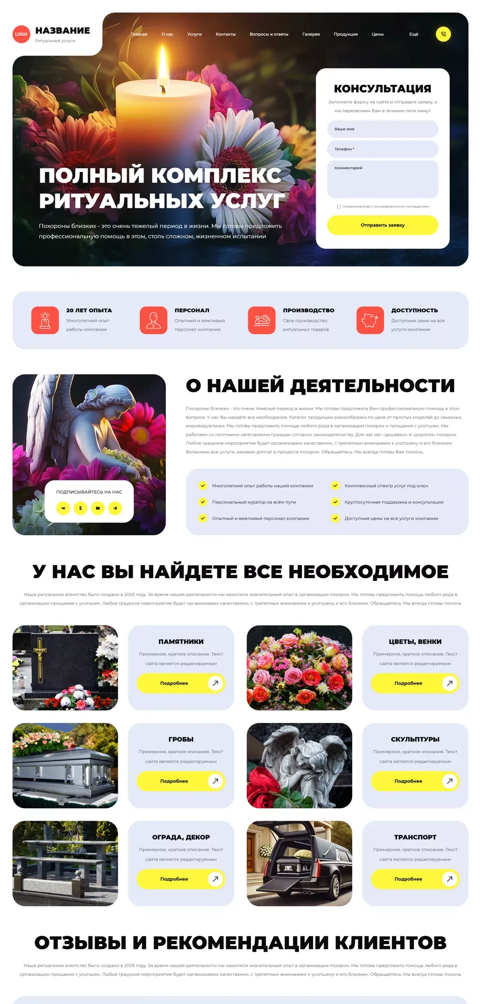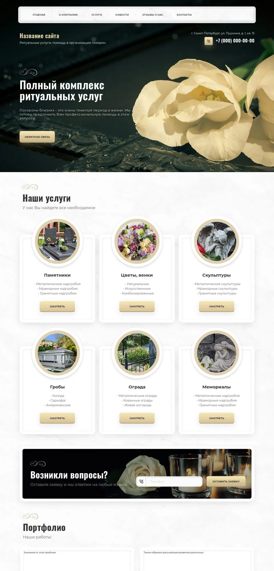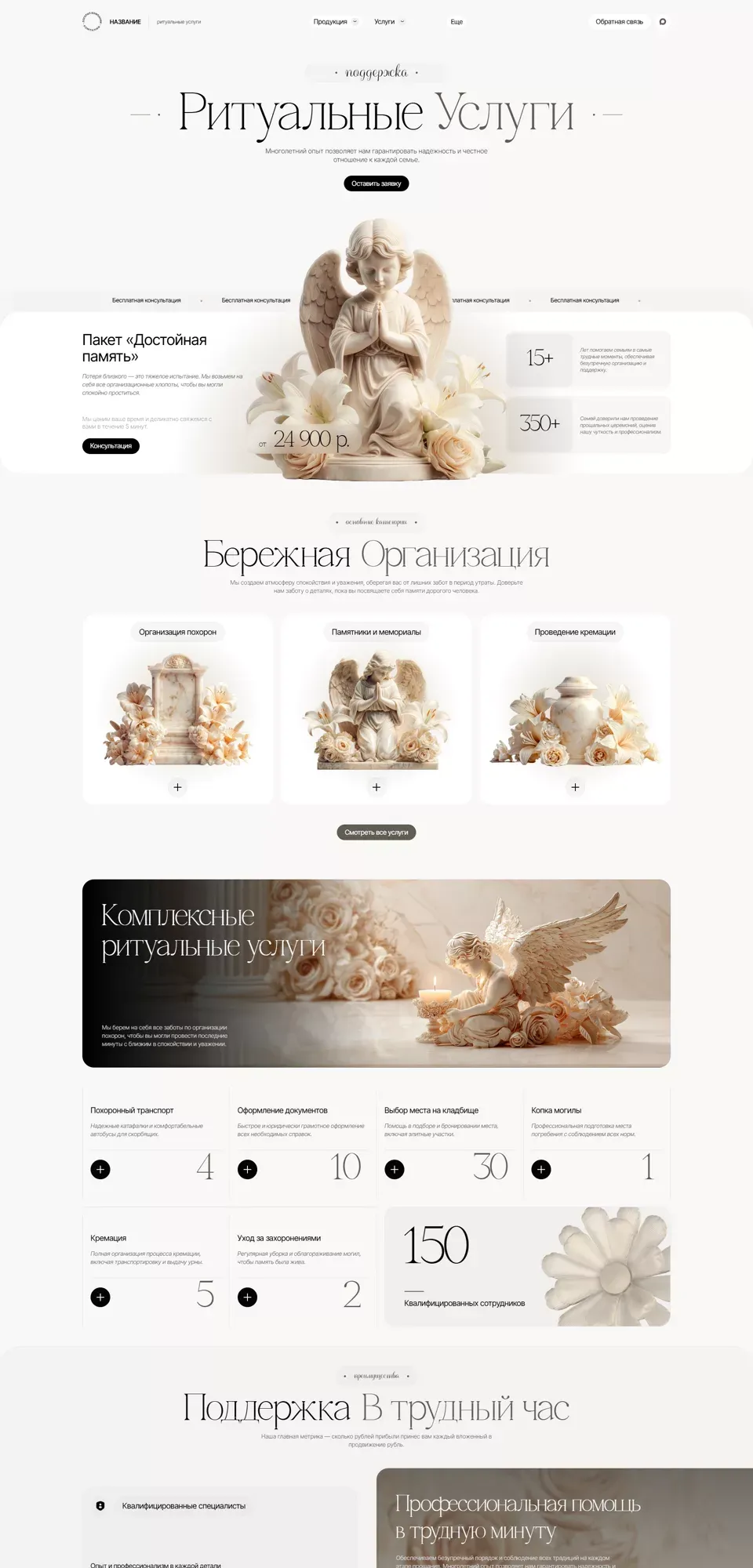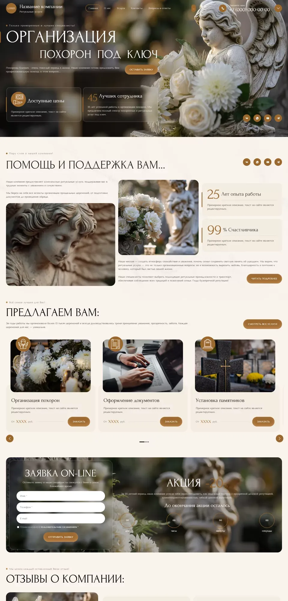 Я создаю сайты с учетом специфики ритуальной сферы: спокойный дизайн, удобная структура, быстрый доступ к услугам, ценам, контактам и форме срочной связи. На сайте можно разместить информацию об организации похорон, перевозке, оформлении документов, подборе ритуальных принадлежностей, поминальных обедах и других услугах.