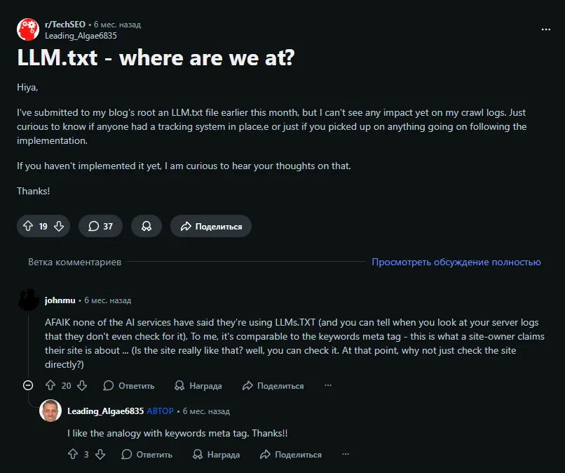 Переводим с сеошного: llms.txt - это как мета-тег keywords. Бесполезный.