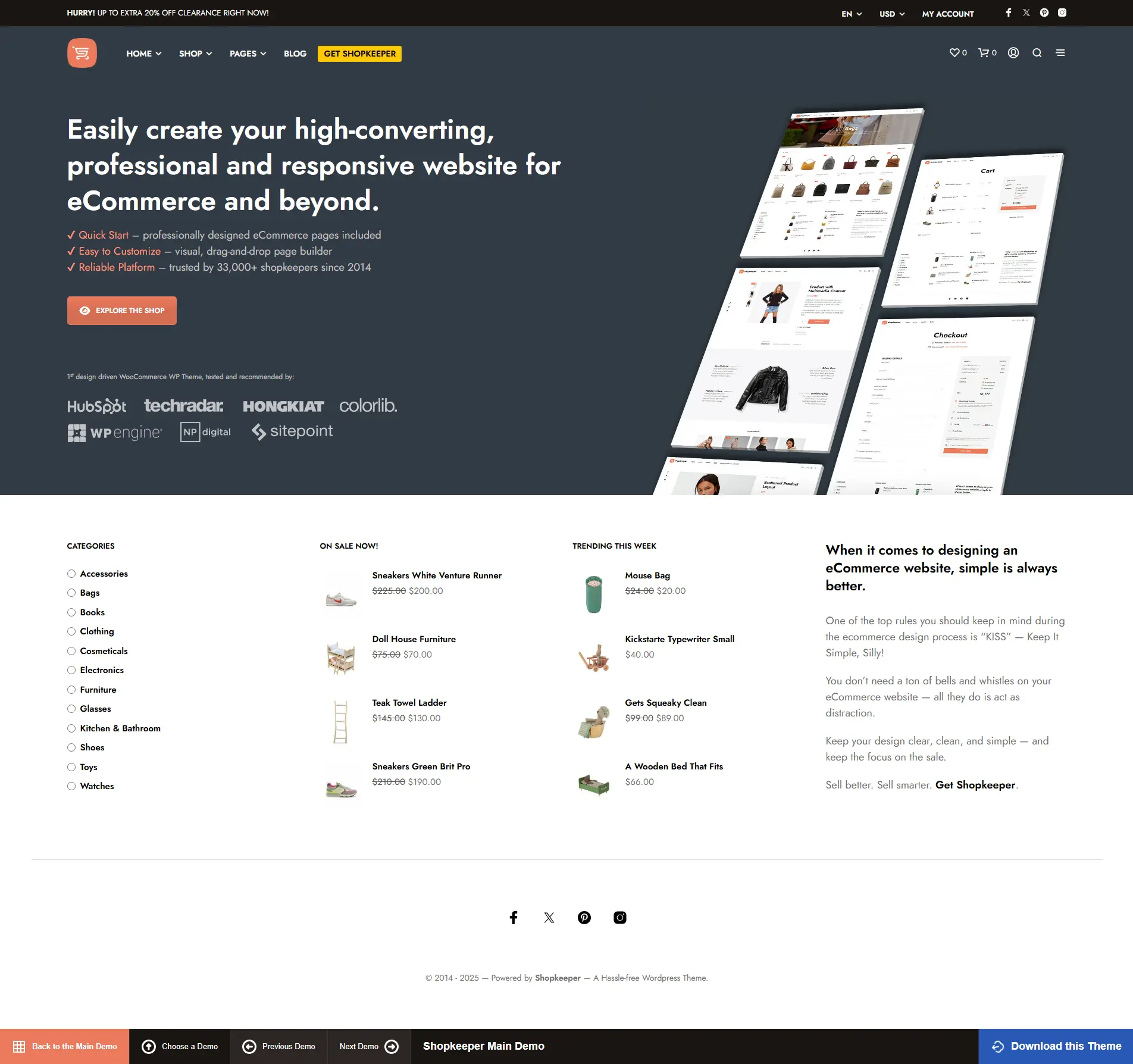 Шаблон Shopkeeper - это мощная, удобная и адаптивная тема для WordPress, специально разработанная для создания интернет-магазинов с поддержкой WooCommerce. Она обеспечивает красивое и корректное отображение сайта на любых устройствах и браузерах благодаря отзывчивому дизайну и поддержке технологии Retina.