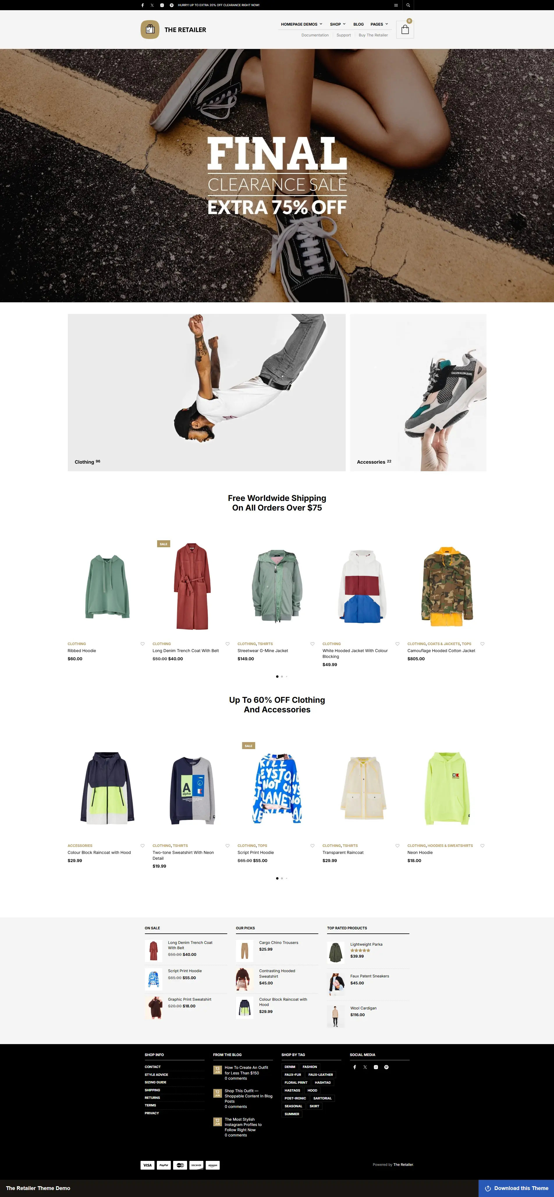 The Retailer - это мощная и универсальная тема WordPress, специально разработанная для создания интернет-магазинов любого масштаба. От небольших бутиков до крупных торговых сетей - эта тема предлагает стильную, современную и минималистичную платформу, которая привлекает внимание покупателей и повышает продажи. Она адаптивна и отлично смотрится на всех устройствах, включая мобильные телефоны и планшеты, благодаря отзывчивому дизайну и графике с высоким разрешением.